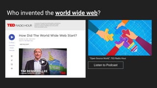 This document provides an overview of an interactive session on science and the read/write web for students. It introduces the inventor of the world wide web, Tim Berners-Lee, and his vision for a collaborative social web. It discusses the evolution of the web from a static read-only version 1.0 to the current more dynamic and social version 2.0. The session plan involves students using Slack for communication, Google Docs and Slides for collaborative creation of presentations on assigned topics, and SlideShare to publish their work to the wider web.