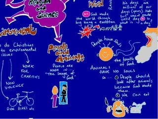 The document describes the biblical account of God creating the world over six days according to the book of Genesis. It provides details of what God created on each of the six days: on day one light, day two the sky, day three dry land and plants, day four the sun, moon and stars, day five sea creatures and birds, and on day sixth land animals and humans. The document also discusses different Christian views on interpreting Genesis, from a literal six-day creation to accepting scientific theories like evolution and the big bang. It explores Christian beliefs around stewardship of the environment and responses to environmental issues.