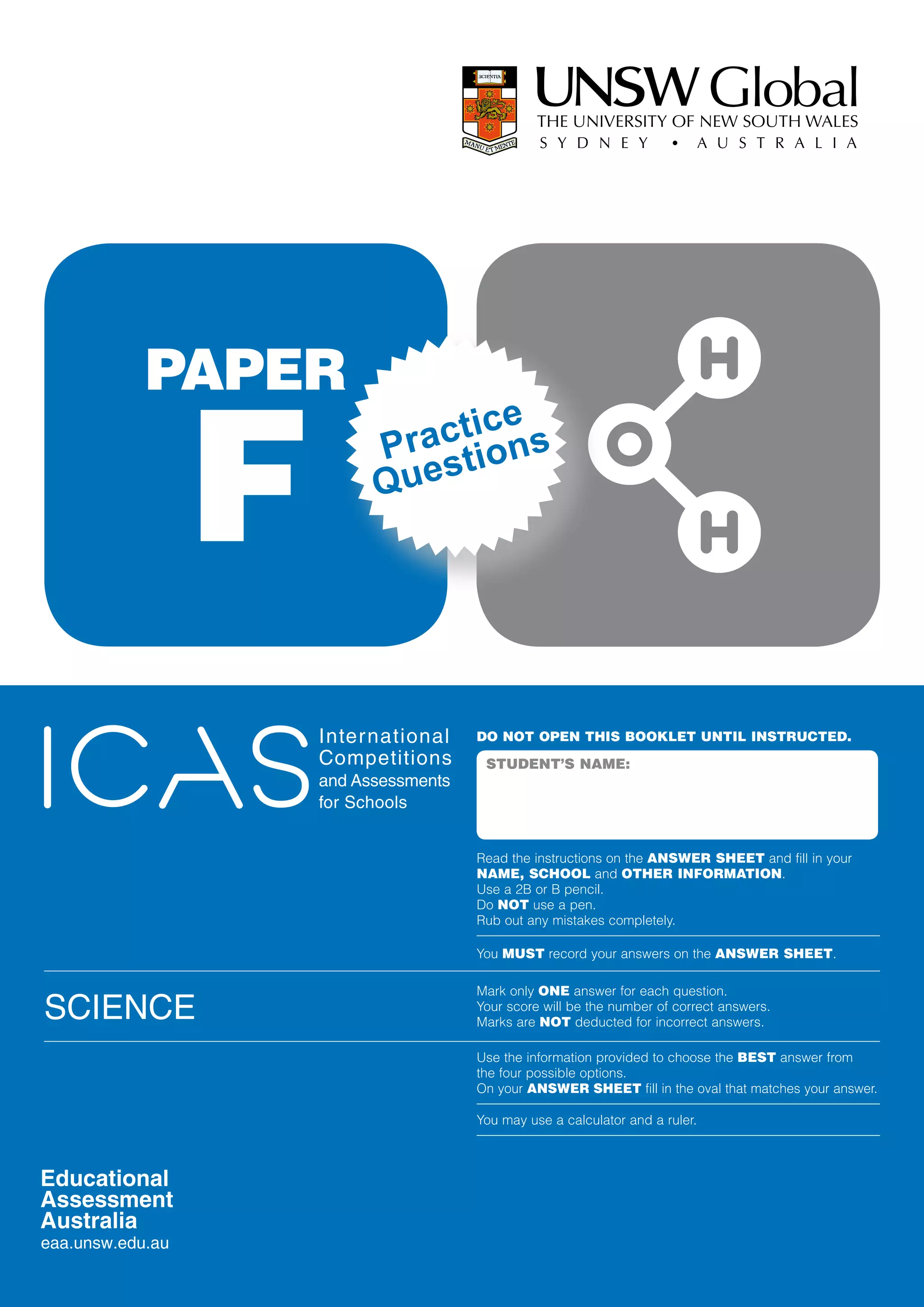 The document is a science practice test containing 10 multiple choice questions about various science topics. The questions cover subjects like planetary satellites, elements, properties of metals, sieving deep sea sediments, mineral gemstones, and writing a science experiment report. Students are instructed to choose the single best answer for each question from the four options provided and record their selections on an answer sheet.
