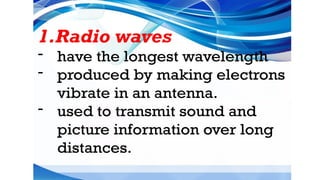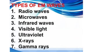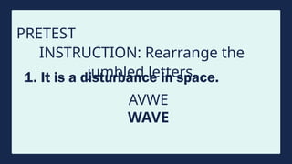 The document provides instructions for a pretest on electromagnetic waves, including key concepts and their definitions such as wave, crest, trough, amplitude, wavelength, and frequency. It covers the properties of electromagnetic waves, their relationship with light, and highlights the contributions of pioneering scientists like James Clerk Maxwell and Heinrich Hertz. Additionally, it outlines the electromagnetic spectrum and emphasizes that EM waves do not require a medium for propagation.