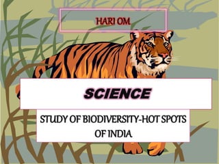 This document discusses biodiversity hotspots in India. It notes that India contains a significant amount of the world's biodiversity, with high percentages of the world's mammal, bird, amphibian, reptile, fish, and flowering plant species having native ranges within India. Several regions in India qualify as biodiversity hotspots due to their large numbers of endemic species and habitat loss, including the Western Ghats, Nilgiris, Anaimalai, Darjeeling hills, and the Andaman Islands. The Western Ghats hotspot contains over 39 protected areas and is considered one of the most biologically diverse regions in the world.