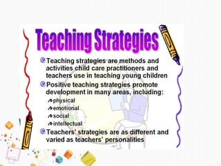 The document discusses how to teach science effectively using modern teaching strategies. It outlines several objectives for teaching science, including understanding its significance, using appropriate methodologies, and making teaching more effective and useful through innovative methods. The document then discusses different teaching strategies, including active and passive approaches. It provides examples of active strategies like demonstrations, discussion groups, and practicing by doing. The document advocates using a mix of traditional and modern teaching methods to create a more interactive learning experience for students.