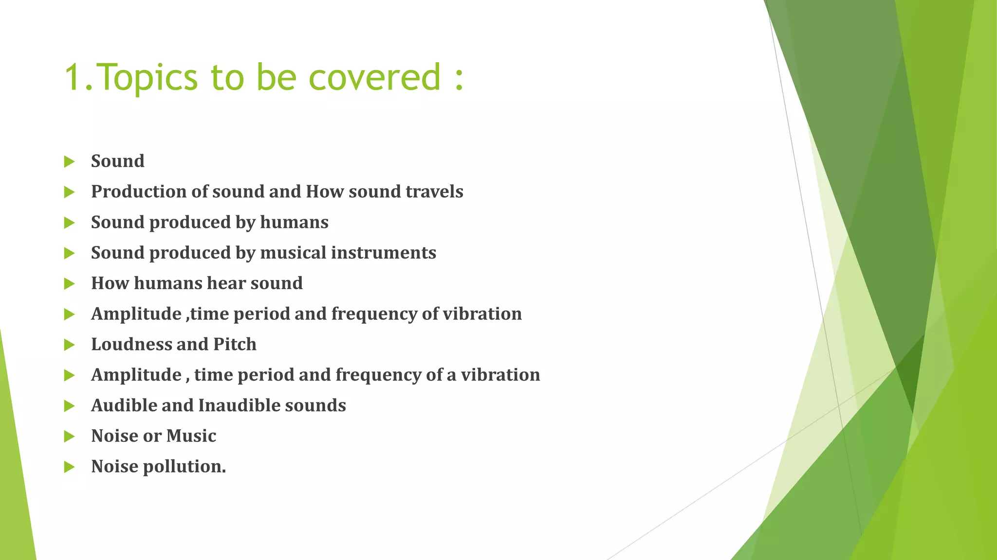 This document provides an overview of topics related to sound, including how sound is produced, how it travels, and how humans hear it. It discusses sound production in humans and musical instruments. Key concepts that will be covered are amplitude, time period, and frequency of vibrations; loudness and pitch; audible and inaudible sounds; noise versus music; and noise pollution and its causes. Musical instruments produce sound through vibrating parts like membranes, air columns, and strings. Humans hear sound when vibrations from the ear canal cause the eardrum and bones in the middle ear to vibrate, setting fluid in the inner ear in motion.