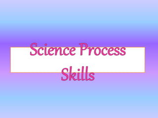 This document discusses several key science process skills: observing using the five senses to gather information, communicating to share information with others such as through drawing or writing, comparing and contrasting how objects are similar or different, classifying by arranging into groups based on rules, measuring characteristics like length and mass, and predicting likely outcomes based on observations. It provides examples of each skill and references a tale of mongo seeds experiment involving observing plant growth over time in a glass jar.