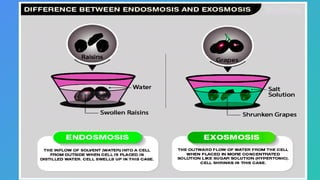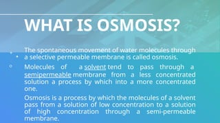 The document describes osmosis as the movement of water molecules through a semi-permeable membrane from a low concentration solution to a high concentration solution. It explains the effects of isotonic, hypotonic, and hypertonic solutions on cells, highlighting that isotonic solutions maintain cell size, hypotonic solutions may cause cells to swell, and hypertonic solutions lead to cell shrinkage. An experiment using raisins and apricots illustrates osmosis, showing how these fruits swell in pure water and shrink in a concentrated sugar and salt solution.