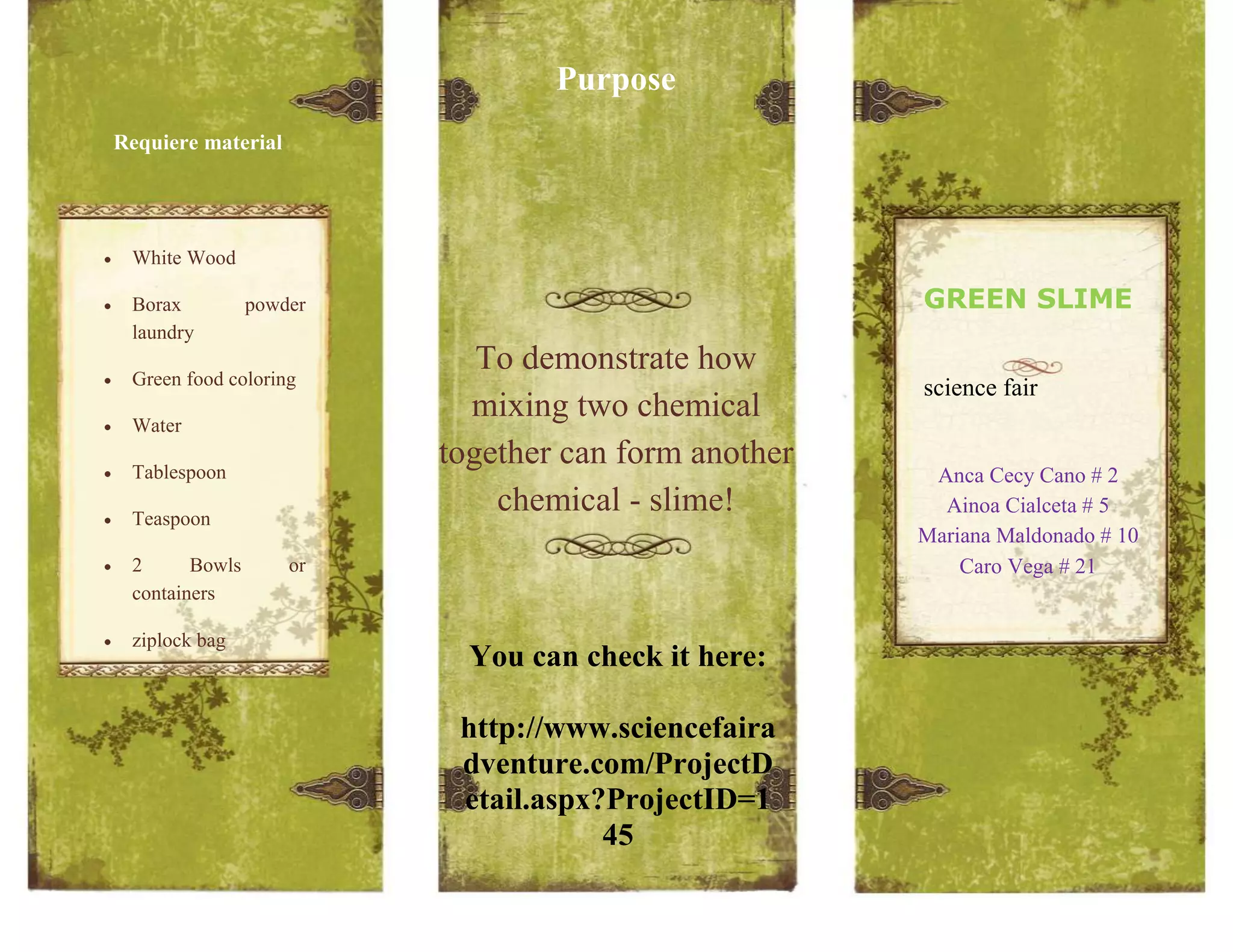 This document provides instructions for making slime as a science fair project. It lists the materials needed: glue, borax powder, water, food coloring. The procedure involves mixing glue and water in one container, and dissolving borax powder in water in a separate container. When the borax solution is added to the glue mixture, the chemicals react and form slime. The slime can be stored in an airtight container and different food coloring can be used to make varied colored slimes.