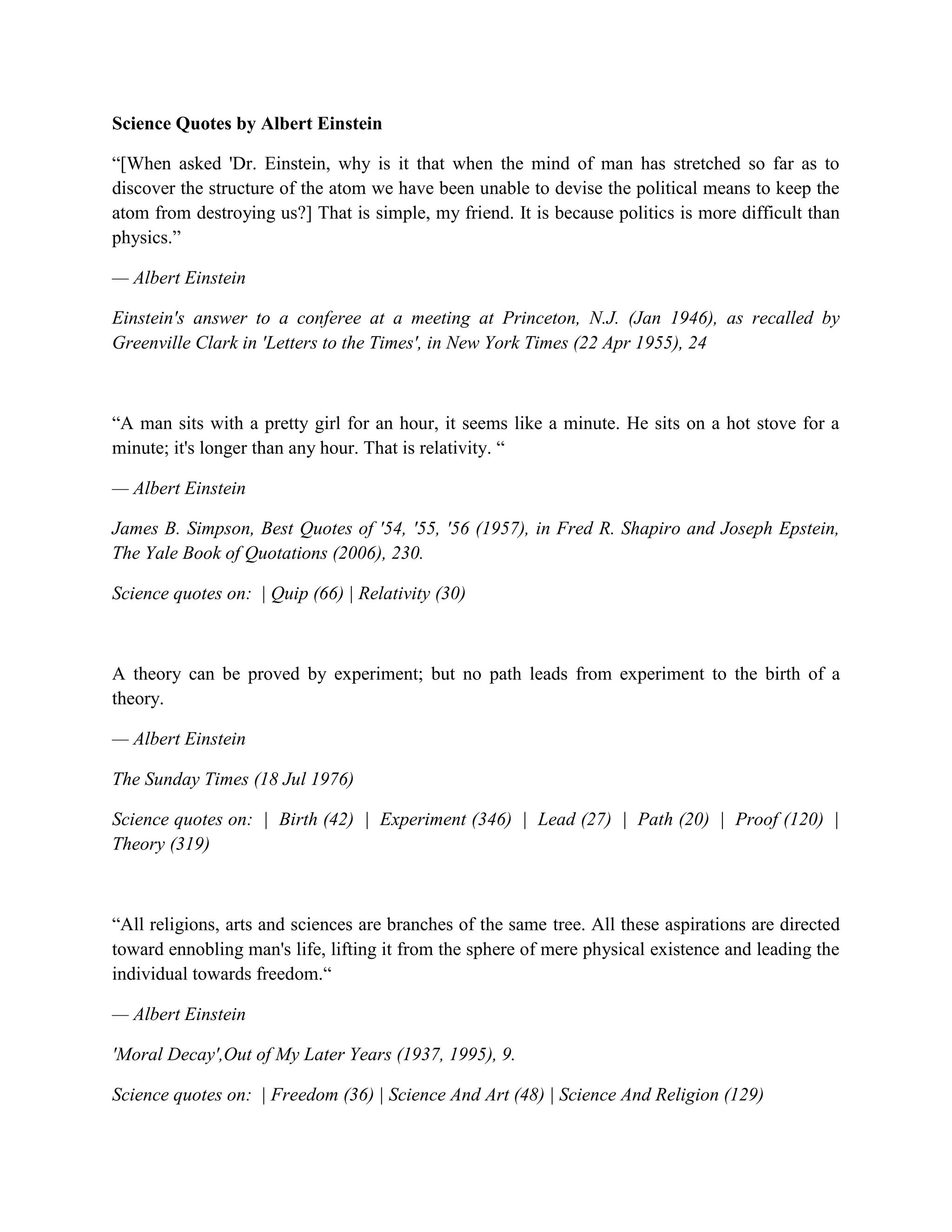 1) Einstein believed that politics is more difficult than physics because while experiments can prove theories in physics, no experiments can give birth to new theories.