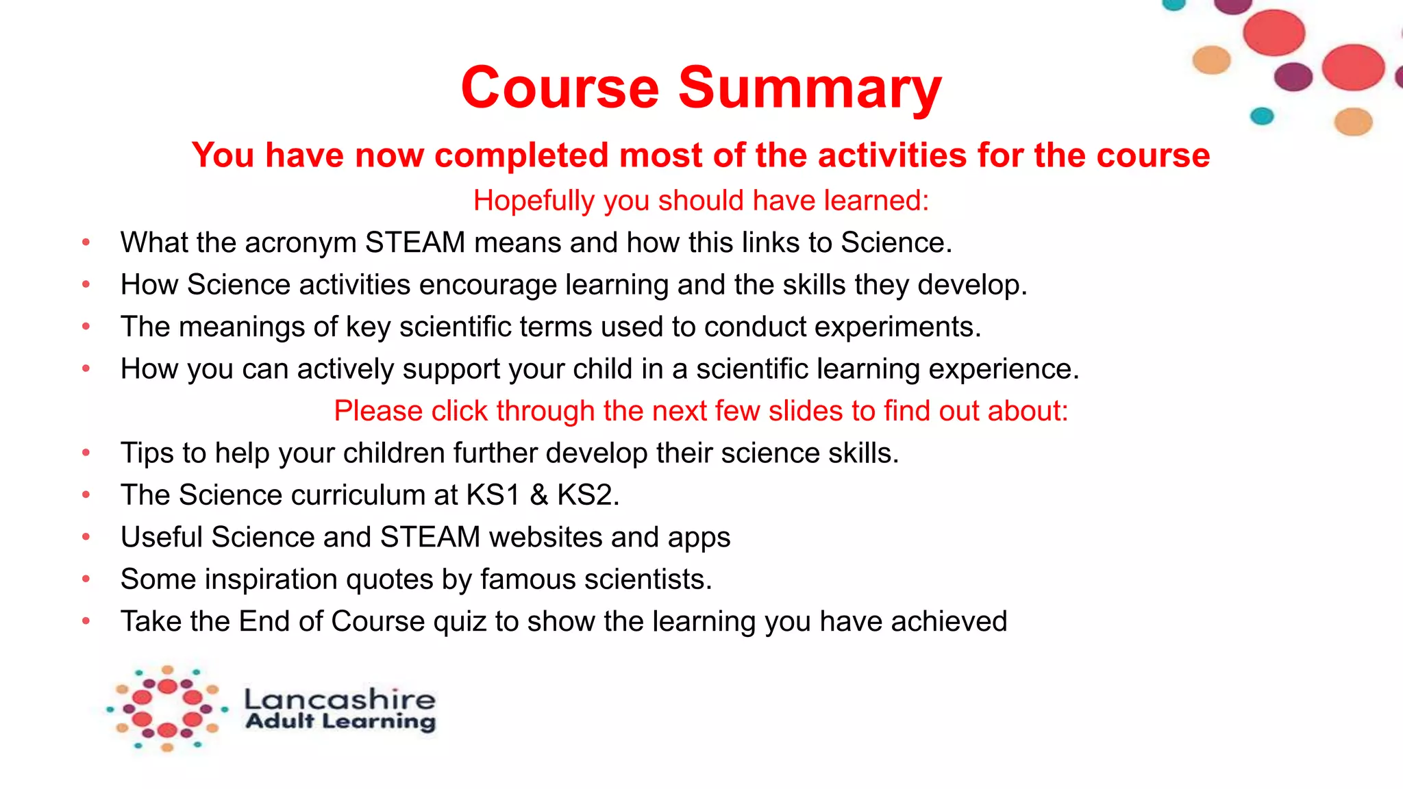 This document provides a summary and assessment of a Science Spectacular course. It outlines what was covered in the course including key scientific terms and how to support children's science learning. It then provides tips for helping children learn science through exploration and hands-on activities. It describes the UK science curriculum for primary school levels Key Stage 1 and 2. Finally, it lists useful science websites, apps, quotes by famous scientists and invites the reader to take a quiz to assess their learning.
