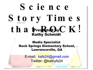 This document provides an overview of science story times presented by Kathy Schmidt at Rock Springs Elementary School. Each month from September to May focuses on a different science topic. Activities include making rain, bubbles, slime and snow as well as reading related picture books and discussing science concepts like the states of matter. Students also learn about recycling and ocean conservation.