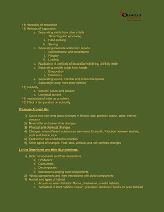 The document outlines the science syllabus for class 6 students covering topics like food and its components, fibre to fabric, sorting and separation of materials, changes around us, living organisms and their surroundings, motion and measurement of distances, light, shadows and reflections, electricity and circuits, fun with magnets, and our environment. It provides detailed descriptions of each topic with subtopics and concepts to be covered. The syllabus aims to educate students about various scientific concepts in different domains including biology, physics, and chemistry.