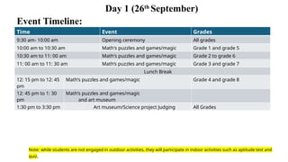 The document outlines the event timeline for the academic year 2024-25, detailing activities from September 26th to September 27th. Day 1 includes an opening ceremony, math puzzles, games, and an arts museum, while Day 2 focuses on project and arts exhibitions for various grades, culminating in an award ceremony. Responsibilities for teachers and judges are also specified, along with judging criteria for projects and science exhibits.