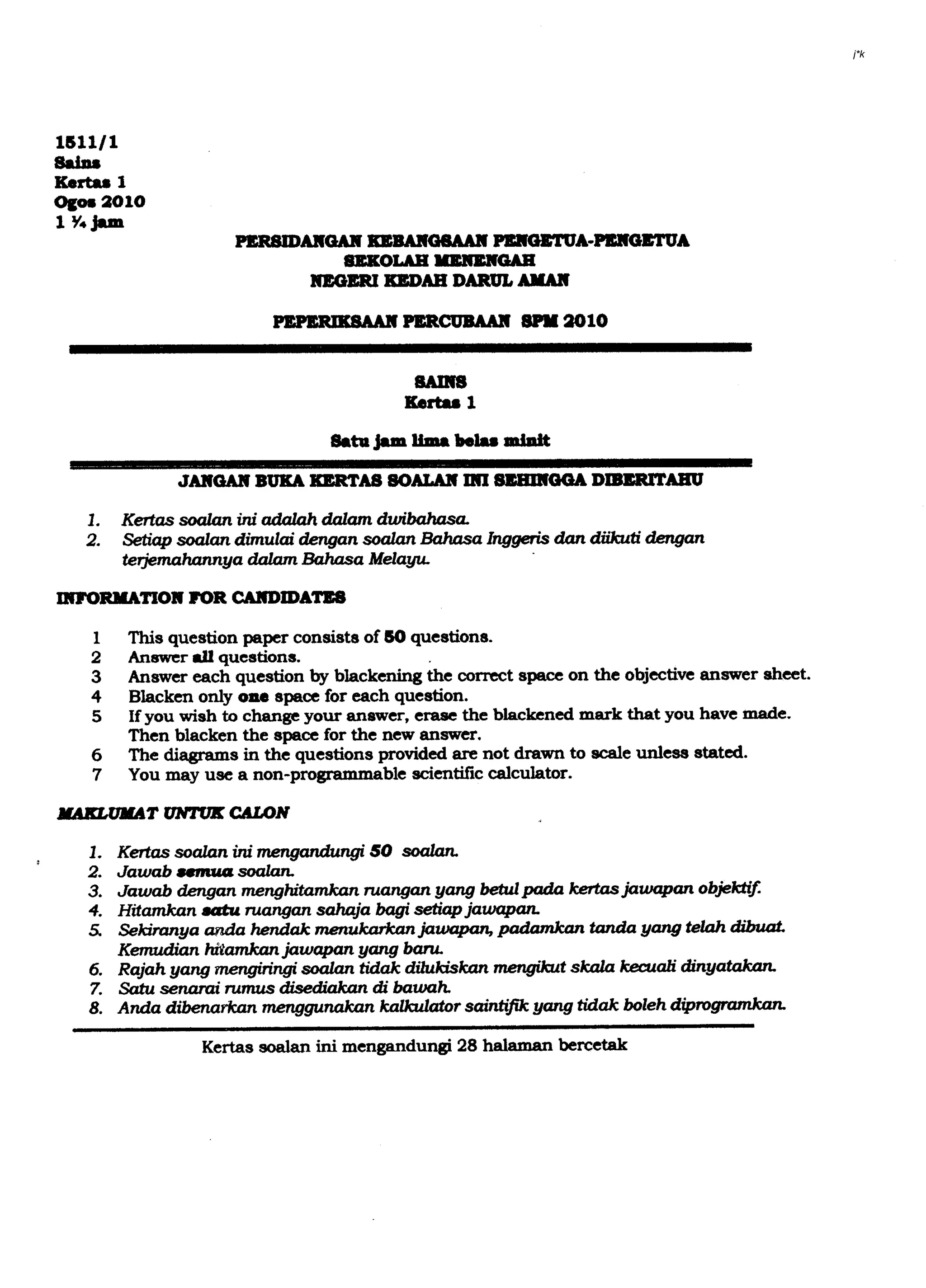 This document contains the marking scheme for the 2010 Kedah State SPM trial exam for Science Papers 1 and 2. It provides the answers to all questions on the papers and criteria for awarding marks. The marking scheme is confidential and for examiners only, and may not be shared or reproduced in any form without permission. It contains 12 pages of information on how to evaluate student responses for the Science exam.
