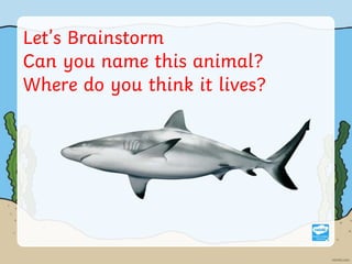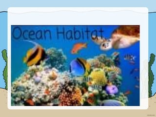 This document provides an interactive lesson on animals that live in ocean habitats. It begins with examples of different ocean animals like angelfish, clownfish, crabs, dolphins, jellyfish, octopuses, sea turtles, seahorses, sharks, and starfish. For each animal, it provides 1-2 facts about where they live and what they eat. The learning objective is for students to name different ocean animals and learn about their habitats and diets. It concludes with suggestions for follow up activities for students to sort ocean and desert animals and design their own ocean habitat.