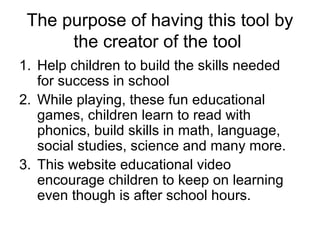 This document discusses an educational website for children. It provides fun games, videos, and activities to help children learn skills like reading, math, science, and more. The website can be used in classrooms or at home. It is suitable for ages 3-7 and focuses on topics like animals, seasons, and science. While it is easy to use and has no ads, it may not foster deeper learning or real-life application. Some games emphasize drill/practice over constructivism.
