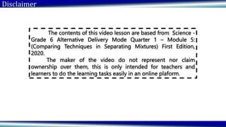 This document provides information about separating mixtures using different techniques. It begins with an introduction to the lesson which explains that students will learn various methods for separating components of mixtures and how to determine the best method. It then provides examples of mixtures and asks students to identify the appropriate separation technique for each. The techniques discussed include sieving, handpicking, using magnets, evaporation, filtration, distillation, and decantation. Students are given activities to practice applying their understanding of separating mixtures using the correct techniques.