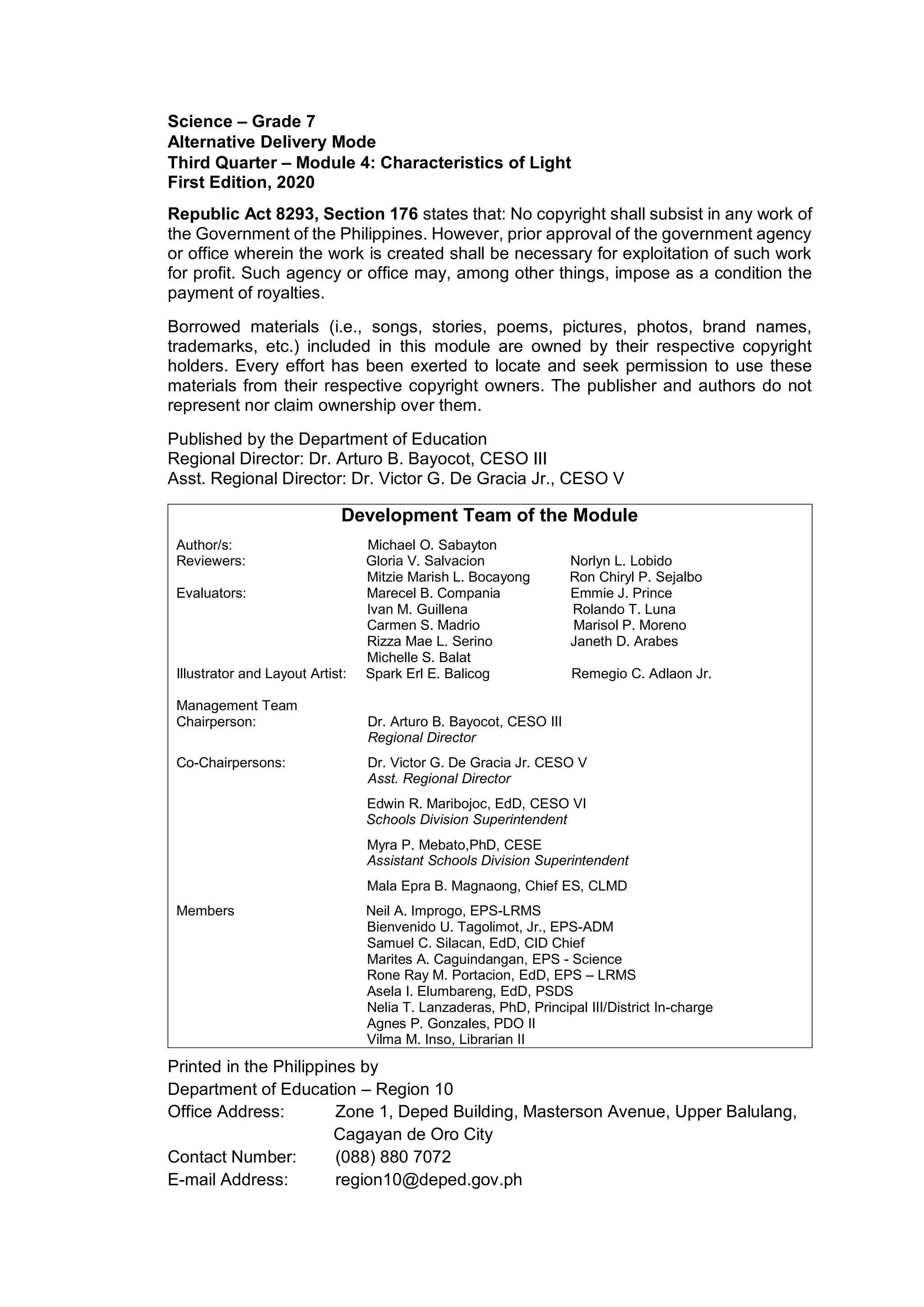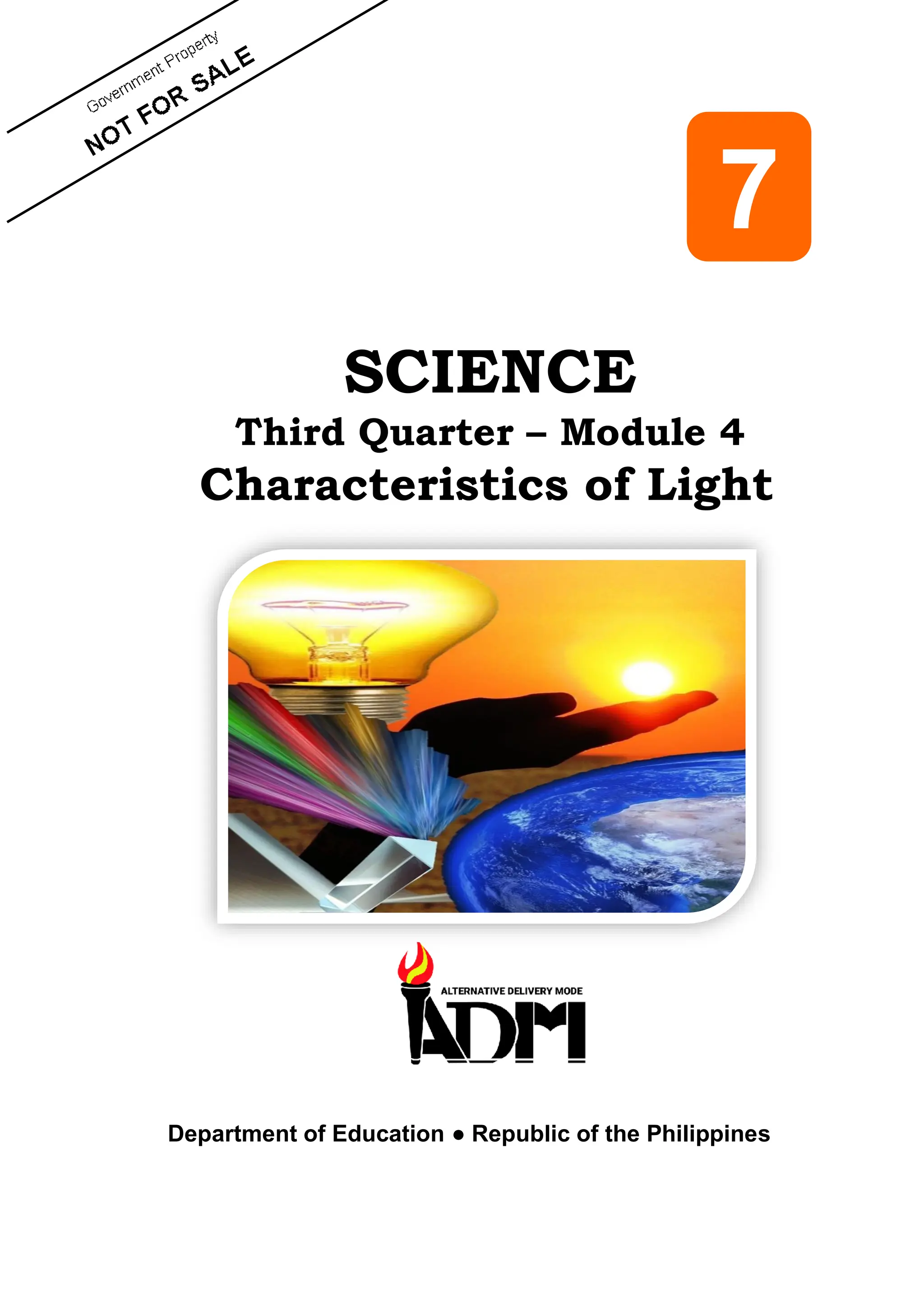 This document is a science educational module for Grade 7 students in the Philippines, focusing on the characteristics of light. It outlines the structure of the module, the importance of light, and various activities designed for independent learning about light's properties, such as wavelength, frequency, and brightness. The module emphasizes guided learning and includes assessments to evaluate understanding of the topics covered.