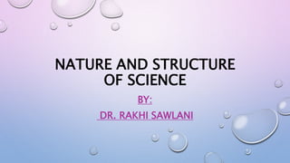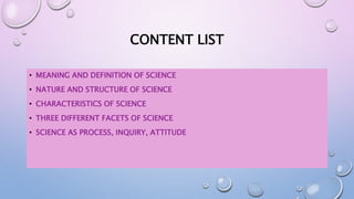 This document discusses the nature and structure of science. It defines science as a systematic and organized body of knowledge accumulated through empirical observations and experimentation. The key aspects covered include: