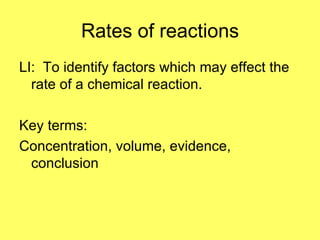 The document discusses factors that can affect the rate of a chemical reaction, including concentration, temperature, and surface area. It provides examples of reactions that occur at different rates, such as paint drying versus metal nail rusting. The document also describes an experiment to investigate how concentration affects the rate of a reaction between solutions X and Y by measuring the time taken for the solution to change color when different amounts of solution Y are added.