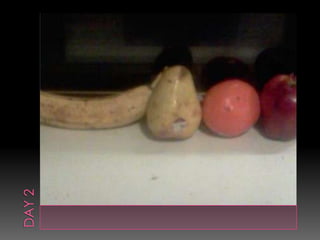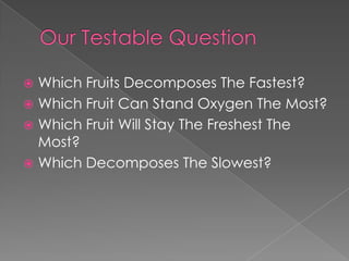 The document describes a science experiment to determine which fruit decomposes the fastest when left out in warm temperatures and oxygen. The students hypothesized the apple would last the longest. Over several days, they observed the pear decaying quickest, followed by the banana, while the apple and orange decomposed more slowly.
