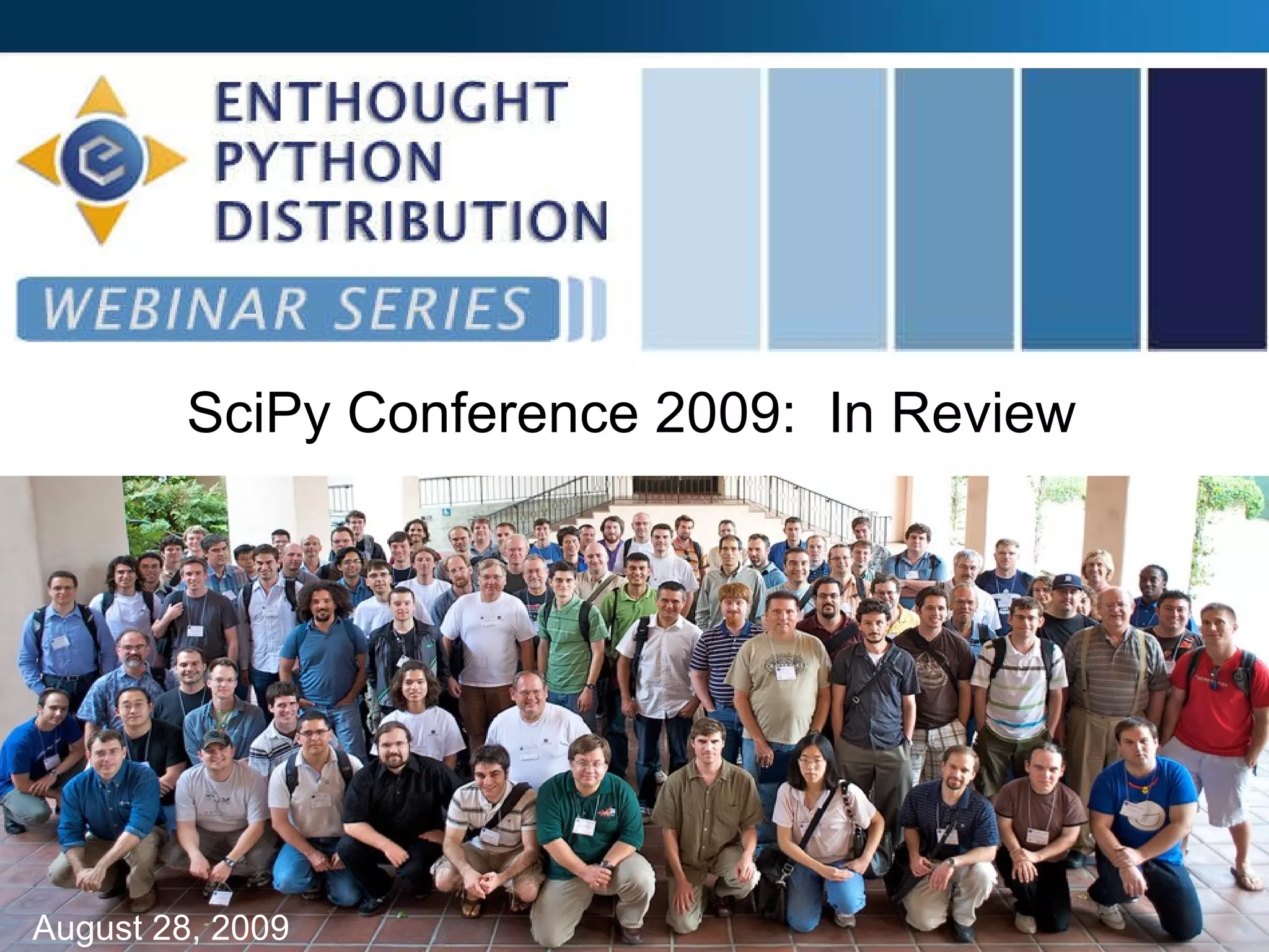 The SciPy Conference 2009 held at Caltech attracted approximately 140 attendees and featured tutorials, keynotes, and various talks on scientific computing topics. Key speakers included Peter Norvig and Jonathon Guyer, covering topics like finite volume PDE solvers and visualization techniques. Additionally, sessions on Cython, HPC, and scientific Python educational initiatives were discussed, along with announcements of upcoming conferences and funding for educational projects.