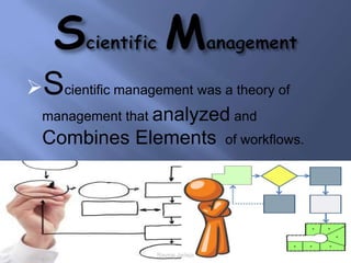Scientific management was a theory developed in the late 19th/early 20th century to improve economic efficiency, especially labor productivity. It involved determining the most efficient ways to perform tasks through time and motion studies. Key figures who developed it included Frederick Taylor, Henry Gantt, and Frank and Lillian Gilbreth. While it increased productivity and standardization, it was also criticized for being exploitative and depersonalizing work. Elements of scientific management like standardization and productivity studies are still used in management today.