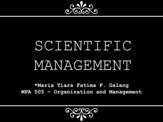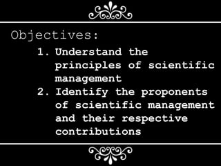 Scientific management aimed to improve industrial efficiency. Frederick Taylor developed its core principles: (1) scientifically analyze each job element; (2) scientifically select and train workers; (3) cooperate with workers; (4) equally divide work and responsibility. The Gilbreths used time-motion studies to standardize processes. Henry Gantt focused on production scheduling using Gantt charts. While scientific management improved productivity, it was criticized for treating workers like machines and excluding senior management tasks.