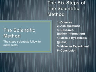 Scientists follow six key steps to develop and conduct tests: 1) make observations, 2) ask questions, 3) conduct research to gather information, 4) develop hypotheses or educated guesses, 5) design and perform experiments to test the hypotheses, and 6) draw conclusions based on the experimental results.