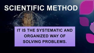 The scientific method is a systematic process for solving problems through observation and experimentation. It involves asking questions, forming hypotheses, conducting experiments, analyzing data, and drawing conclusions. Mario used the scientific method to investigate why the color of a stream's water changes during heavy rains. He observed the problem, formed hypotheses about loose soil or lack of plants causing muddiness, designed an experiment to test his hypotheses, collected and analyzed the experimental data, and concluded that soil without plants causes runoff to become muddy during rains.