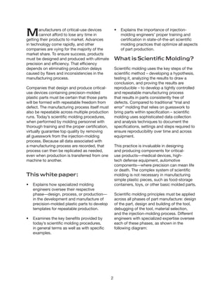 1. Manufacturers of critical devices need precision and efficiency in production to get products to market quickly amid competition. Scientific molding uses data collection and analysis to create a repeatable manufacturing process that produces defect-free parts consistently.