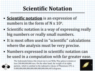 This document provides information on scientific notation and how to perform calculations using numbers expressed in scientific notation. It defines scientific notation as expressing numbers in the form of N x 10x, where N is the coefficient and x is the exponent. It explains how to convert between standard and scientific notation by moving the decimal point based on the exponent. When performing calculations, it describes adding or subtracting exponents for multiplication and division, and converting both numbers to the same exponent for addition and subtraction.