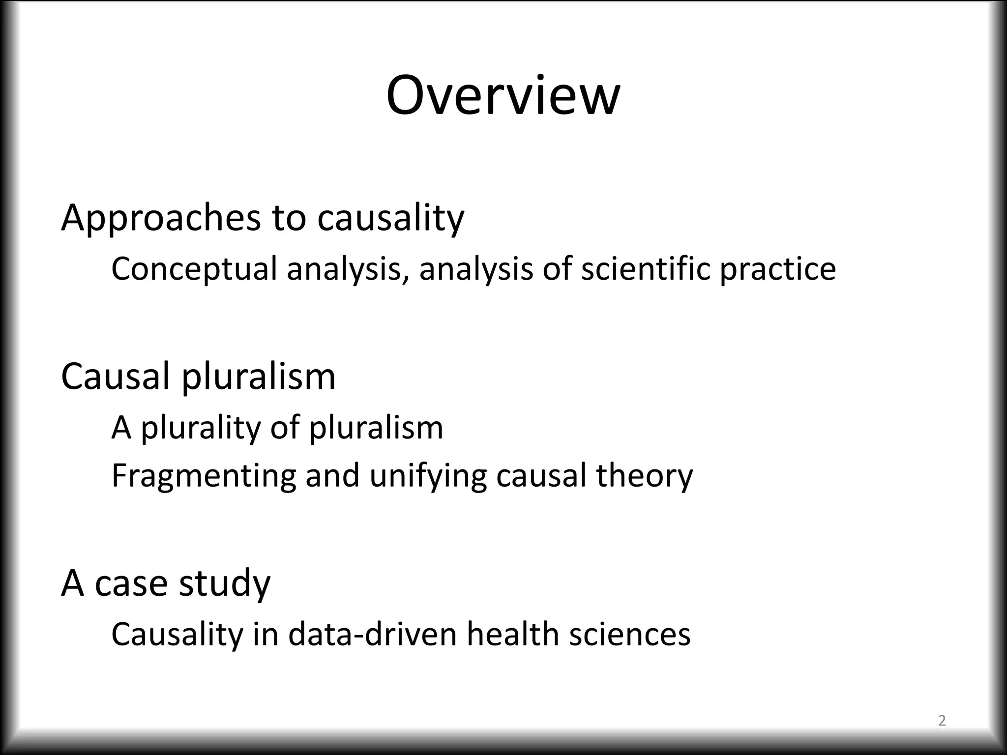 This document discusses different approaches to analyzing causality and the need for a pluralistic view of causation. It addresses conceptual analysis of causality based on intuitions and analysis of scientific practice based on descriptive and normative examination of fields like medicine and social science. It advocates causal pluralism, the idea that causation cannot be reduced to a single concept and must be analyzed using multiple concepts. It also discusses "fragmenting" causal theory by examining different philosophical questions about causation and different scientific problems of causation. Finally, it uses data-driven health sciences as a case study, examining how concepts like mechanisms, correlations, and biomarkers fit into analyzing causation in this context.