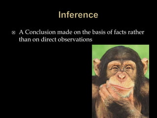 This document defines key scientific concepts like observation, inference, hypotheses, qualitative and quantitative data, independent and dependent variables. It also discusses when to use bar graphs versus line graphs, with bar graphs used for discrete data that can be counted, and line graphs showing relationships over continuous data. Finally, it lists the components of a successful experiment, including running multiple trials with randomly selected subjects and a large sample size to reduce bias.