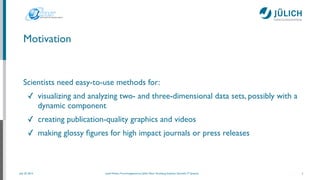 This document summarizes a presentation on using Python for scientific visualization. It discusses using libraries like Matplotlib, Mayavi, VTK, and custom frameworks for 2D and 3D plotting of scientific data. It provides examples of visualizing simulations in real-time, including particle simulations and the Mandelbrot set using just-in-time compilation with Numba for performance. The presentation also demonstrates interactive 3D visualization of MRI data and optimization techniques for Python like vectorization and GPU processing.