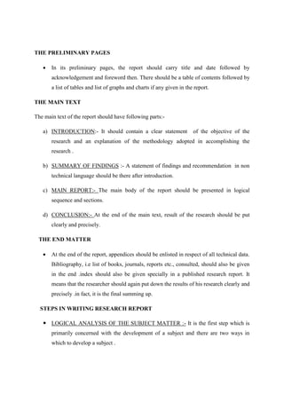 The document provides guidelines for writing research reports. It discusses the key steps and components of a research report, including: