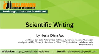 Dokumen ini membahas tentang penulisan ilmiah berdasarkan buku "Menembus Publikasi Jurnal Internasional" yang menguraikan struktur, komponen, dan metode penulisan yang sesuai dengan etika keilmuan. Beberapa komponen penting yang dijelaskan meliputi judul, penulis, abstrak, dan metodologi penelitian. Selain itu, dokumen juga menyoroti pentingnya menyusun hasil penelitian secara informatif dan jelas agar dapat dipahami oleh pembaca.