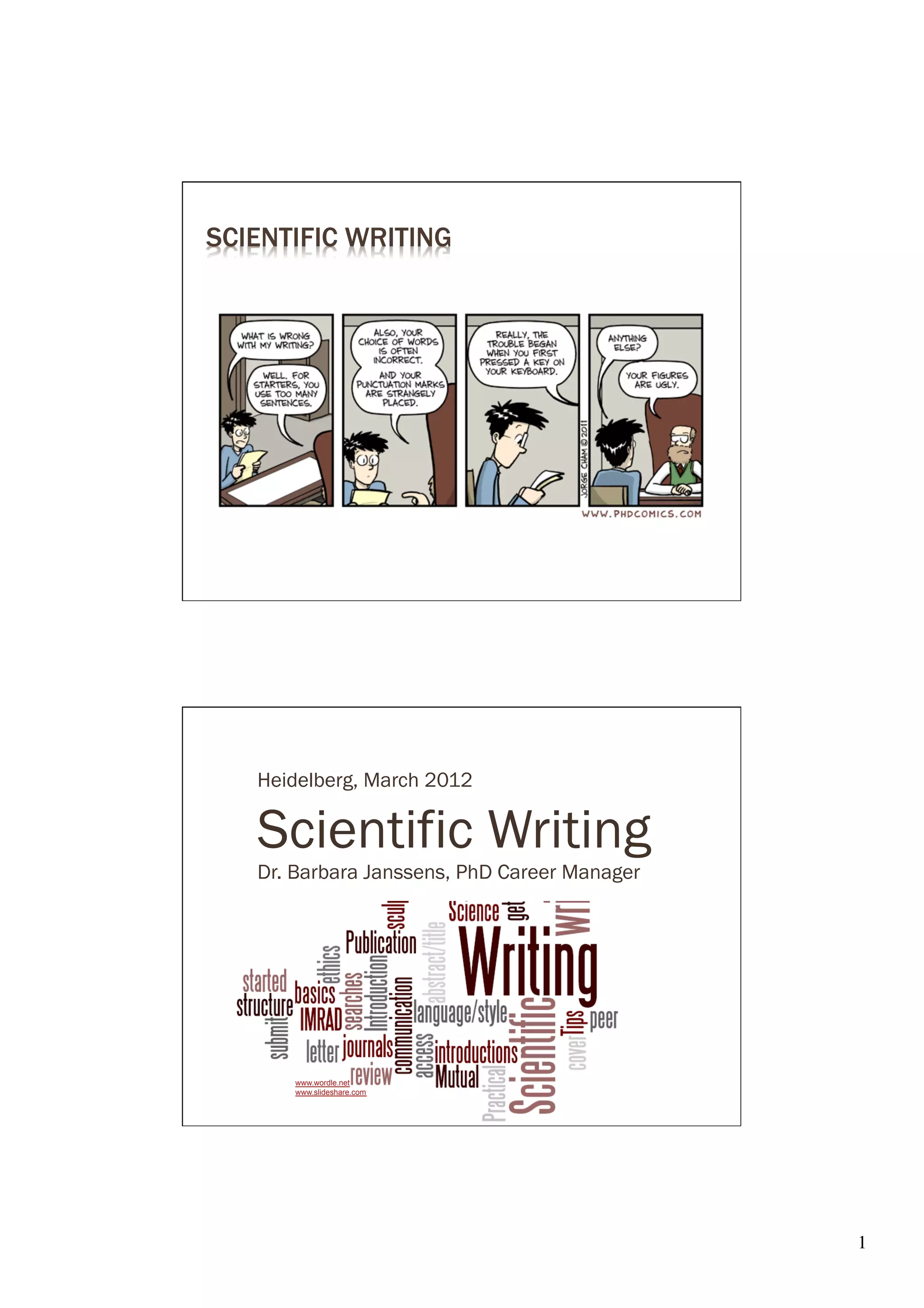 This document provides an overview of scientific writing and careers in science. It discusses the importance of publishing research findings and provides tips for writing papers, CVs, and grant applications. Key aspects of scientific writing covered include choosing an appropriate target journal, following publication ethics, and understanding metrics like impact factor and the h-index. The document also discusses authorship guidelines and issues around plagiarism. Overall, the document serves as a guide for scientists on effectively communicating their work through writing.