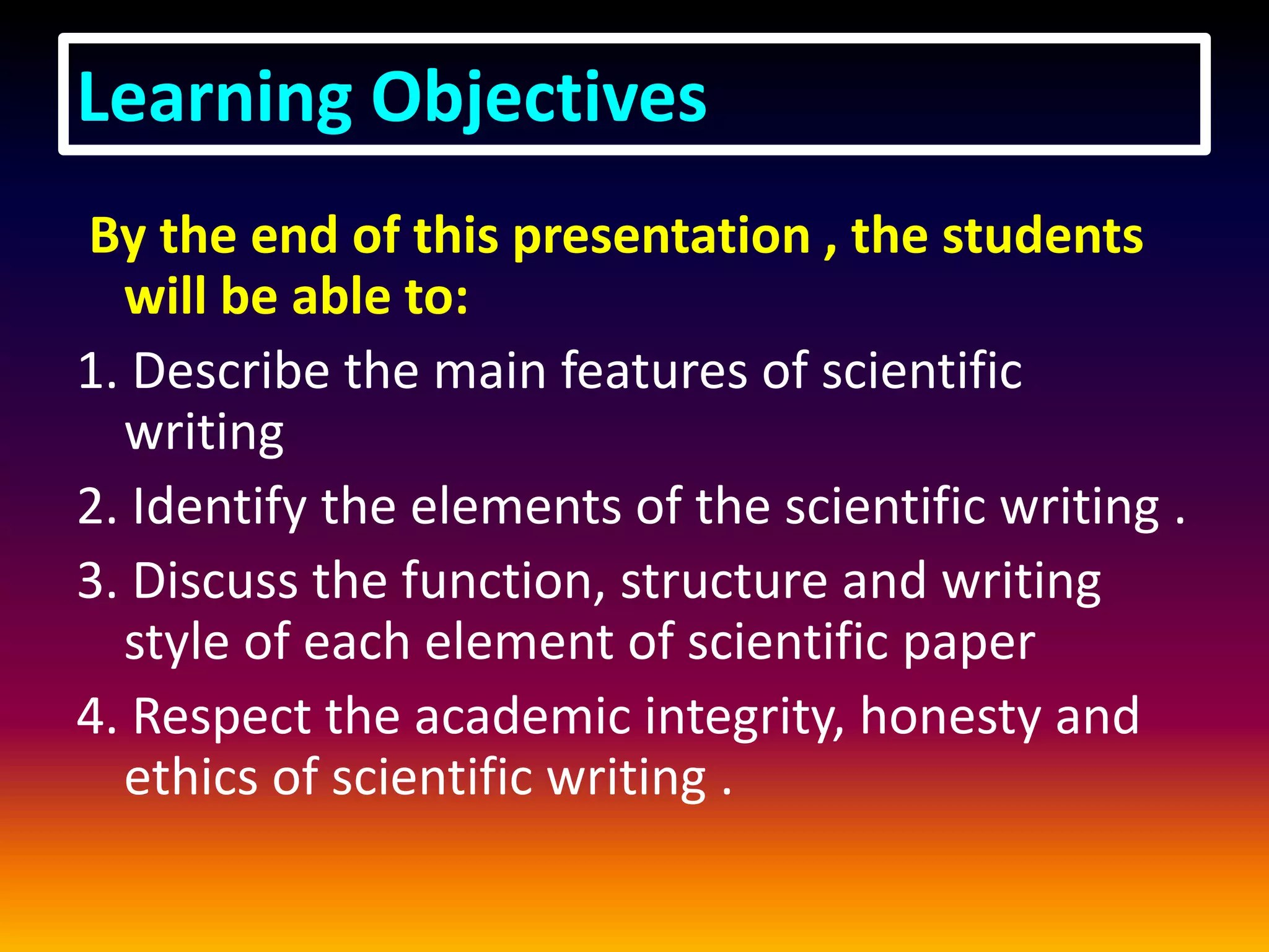 This document provides guidance on scientific writing. It outlines the key characteristics of good scientific writing, including being clear, simple, structured logically, neutral, and accurate. The document then describes the typical elements of a scientific paper, such as the title, abstract, introduction, methods, results, discussion, and references. It also discusses writing tips, such as using active voice and appropriate verb tenses. Finally, the document provides guidance on effectively presenting information in tables, figures, and posters for scientific communication.