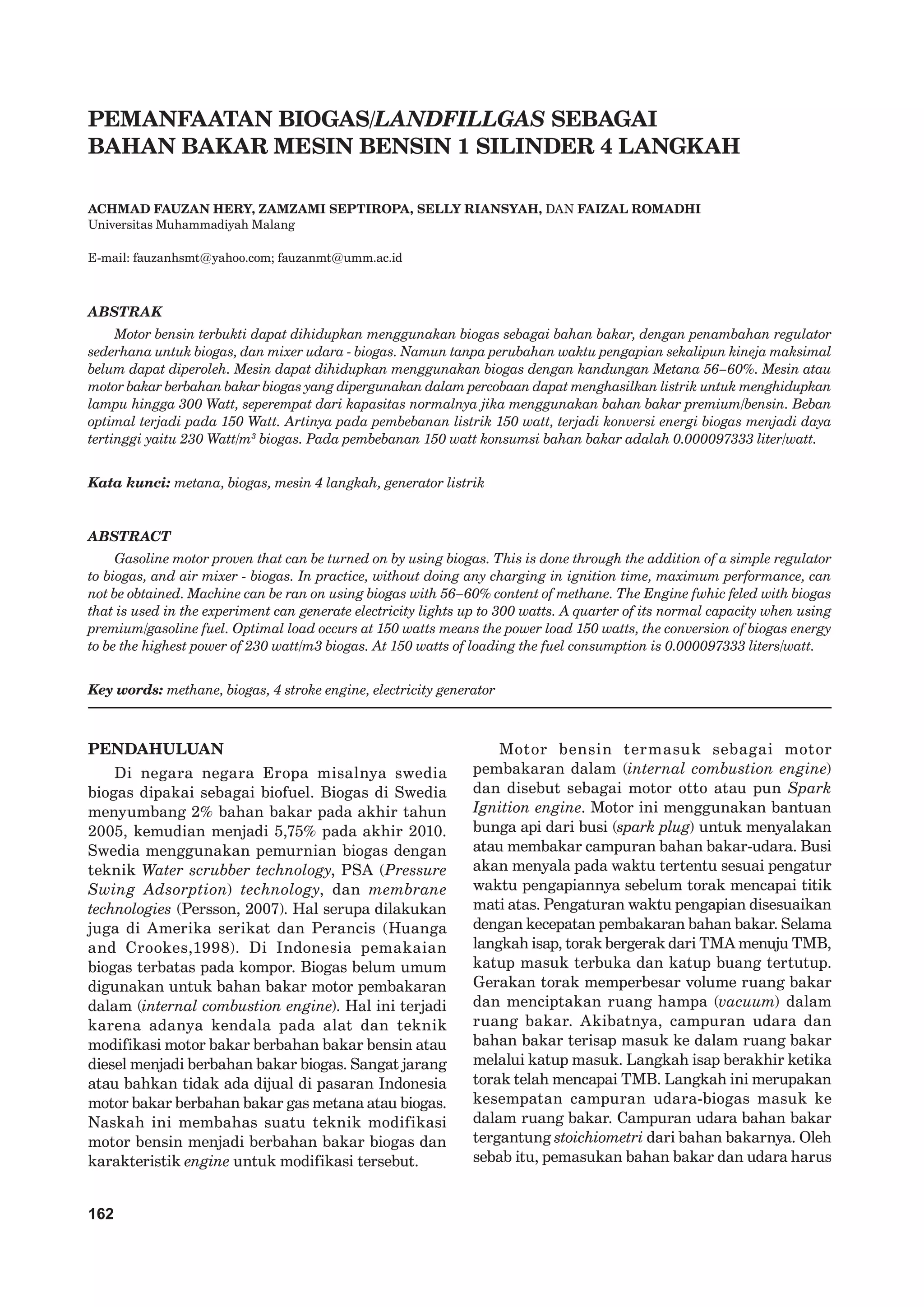 Dokumen ini membahas pemanfaatan biogas sebagai bahan bakar untuk mesin bensin, dengan hasil bahwa mesin dapat dihidupkan menggunakan biogas dengan kandungan metana 56-60%. Melalui pengujian, mesin dapat menghasilkan listrik hingga 300 watt, namun kinerja maksimal belum tercapai tanpa penyesuaian pengapian. Penelitian ini juga mencakup cara modifikasi mesin dan pengaturan komposisi campuran udara-biotgas untuk mencapai efisiensi pembakaran yang lebih baik.