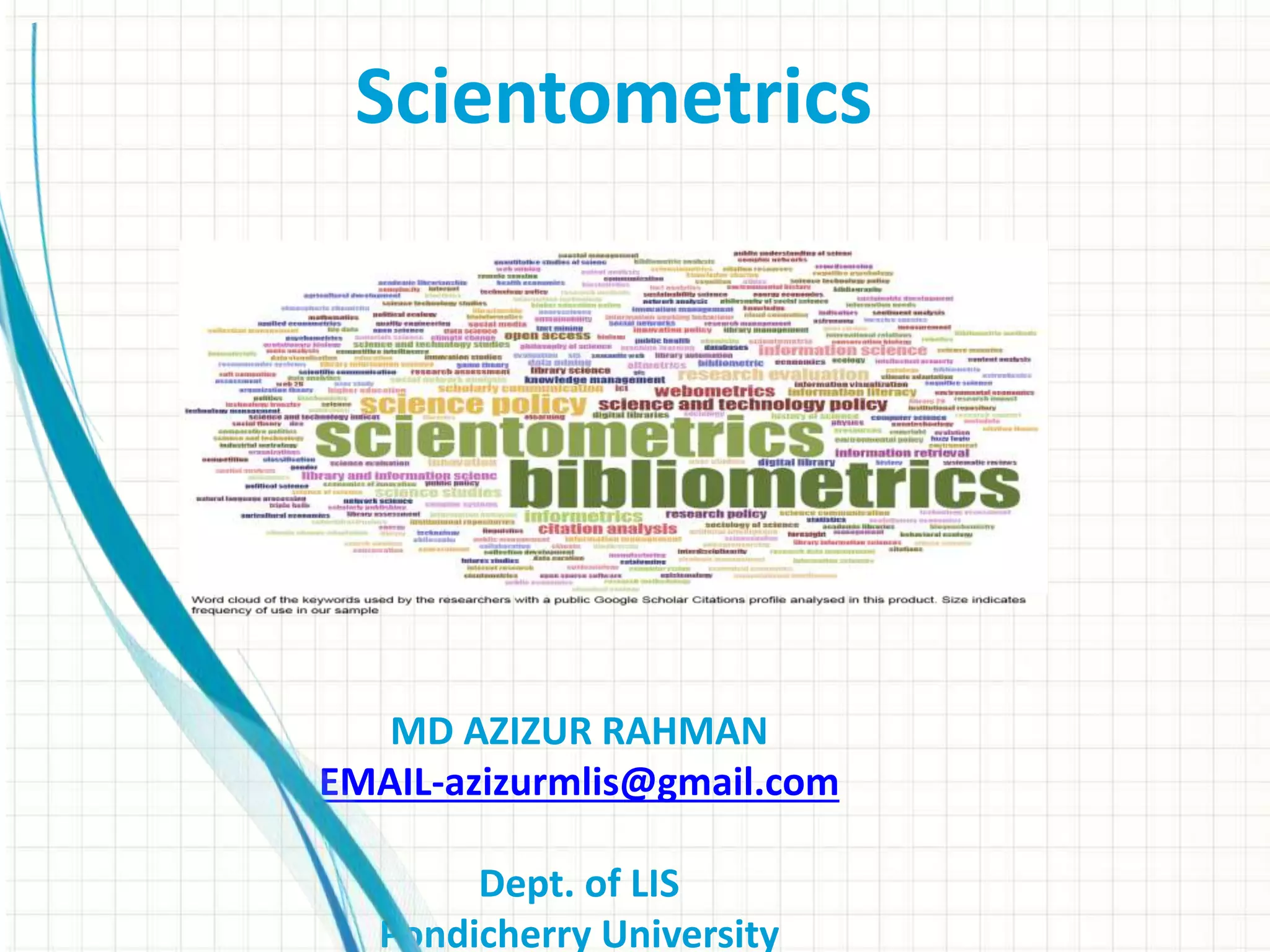 Scientometrics is the quantitative study of science, communication in science, and science policy. It involves the analysis, evaluation, and visualization of science and technology research using quantitative methods. Some key points: