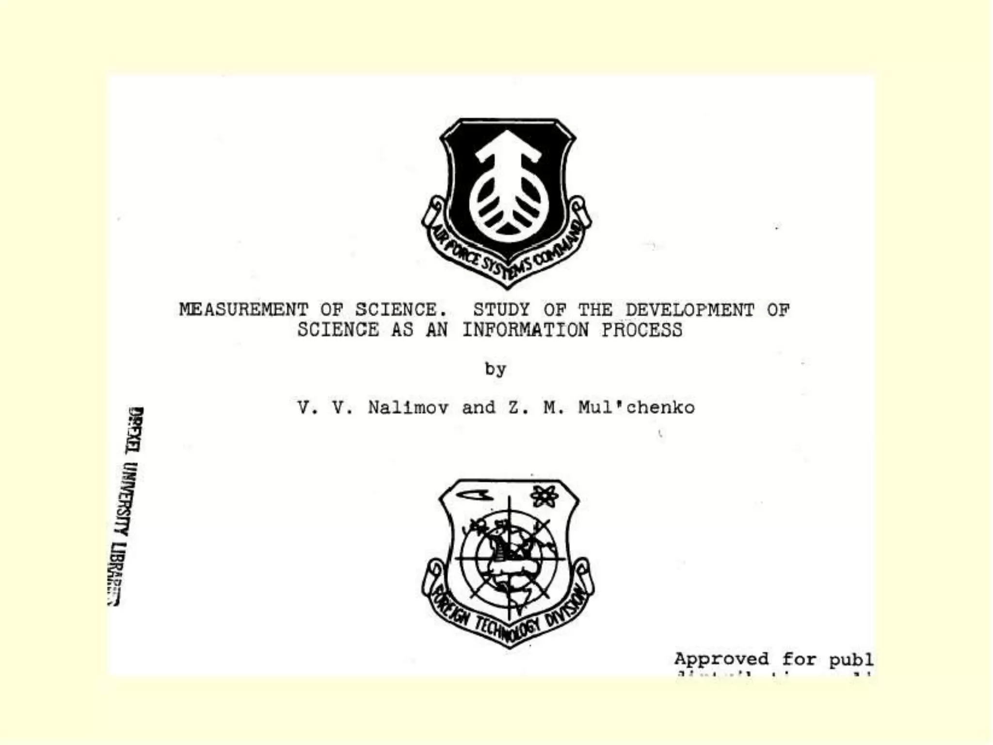 - Scientometrics originated as a Russian term and was coined by Nalimov and Mulchenko in 1969 to describe the application of quantitative methods to the study of science.