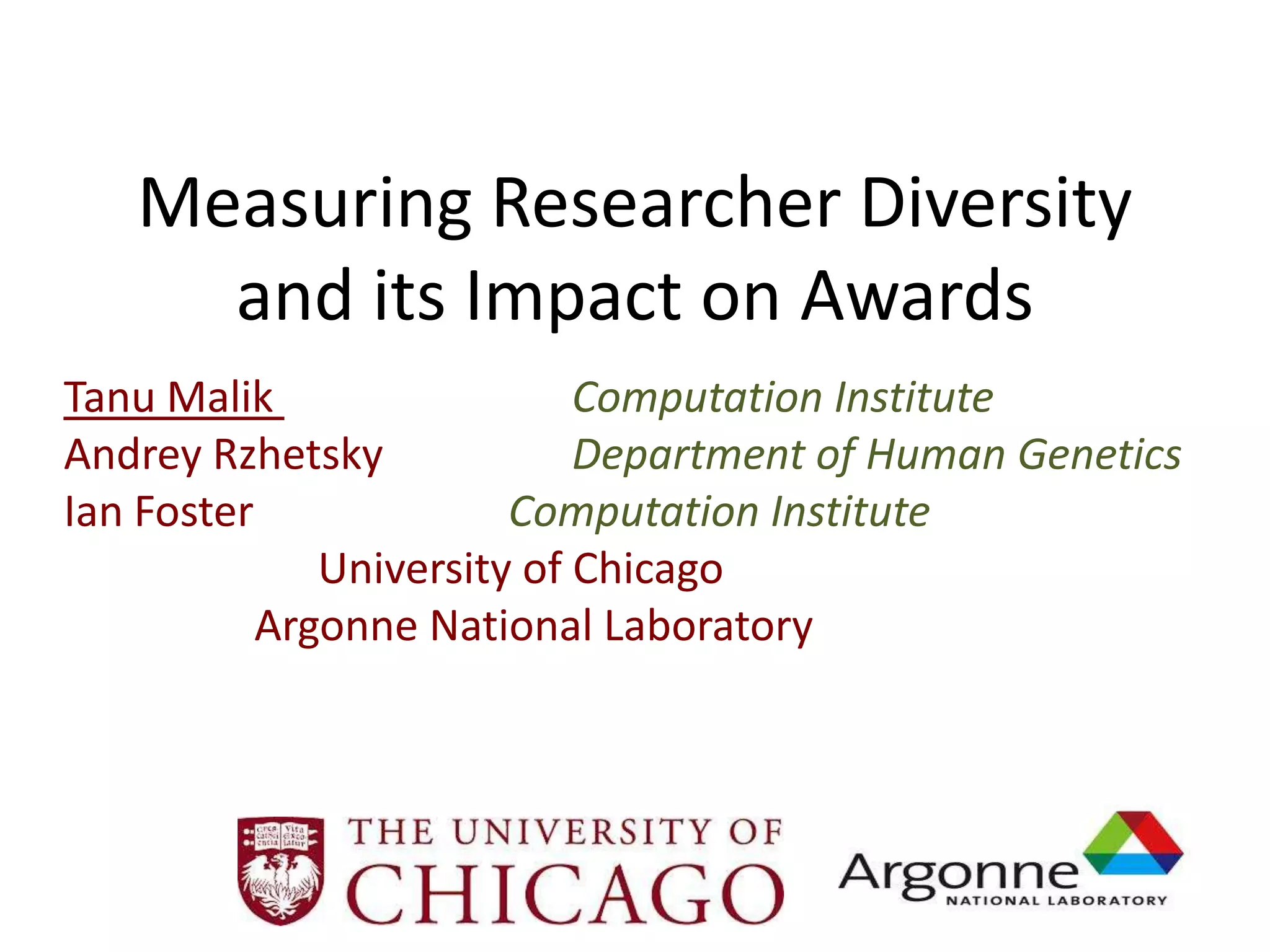 This document proposes a framework to quantify researcher diversity and its impact on productivity and awards. It suggests measuring diversity using Shannon entropy based on researchers' publication topics classified with MeSH terms. Higher diversity is correlated with lower productivity but higher awards. Future work could involve larger datasets and distinguishing specialists in the "long tail" from generalists at the "head of the tail".