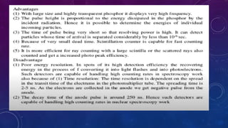 A scintillation counter is an instrument used to detect and measure ionizing radiation by utilizing the excitation effect of radiation on scintillating materials, producing light impulses proportional to the energy of the radiation. It operates using different classes of phosphors and photomultiplier tubes to enhance detection, with applications in medical imaging, environmental monitoring, nuclear security, and safety. Various materials like cesium iodide and sodium iodide serve as scintillators for detecting different types of radiation.