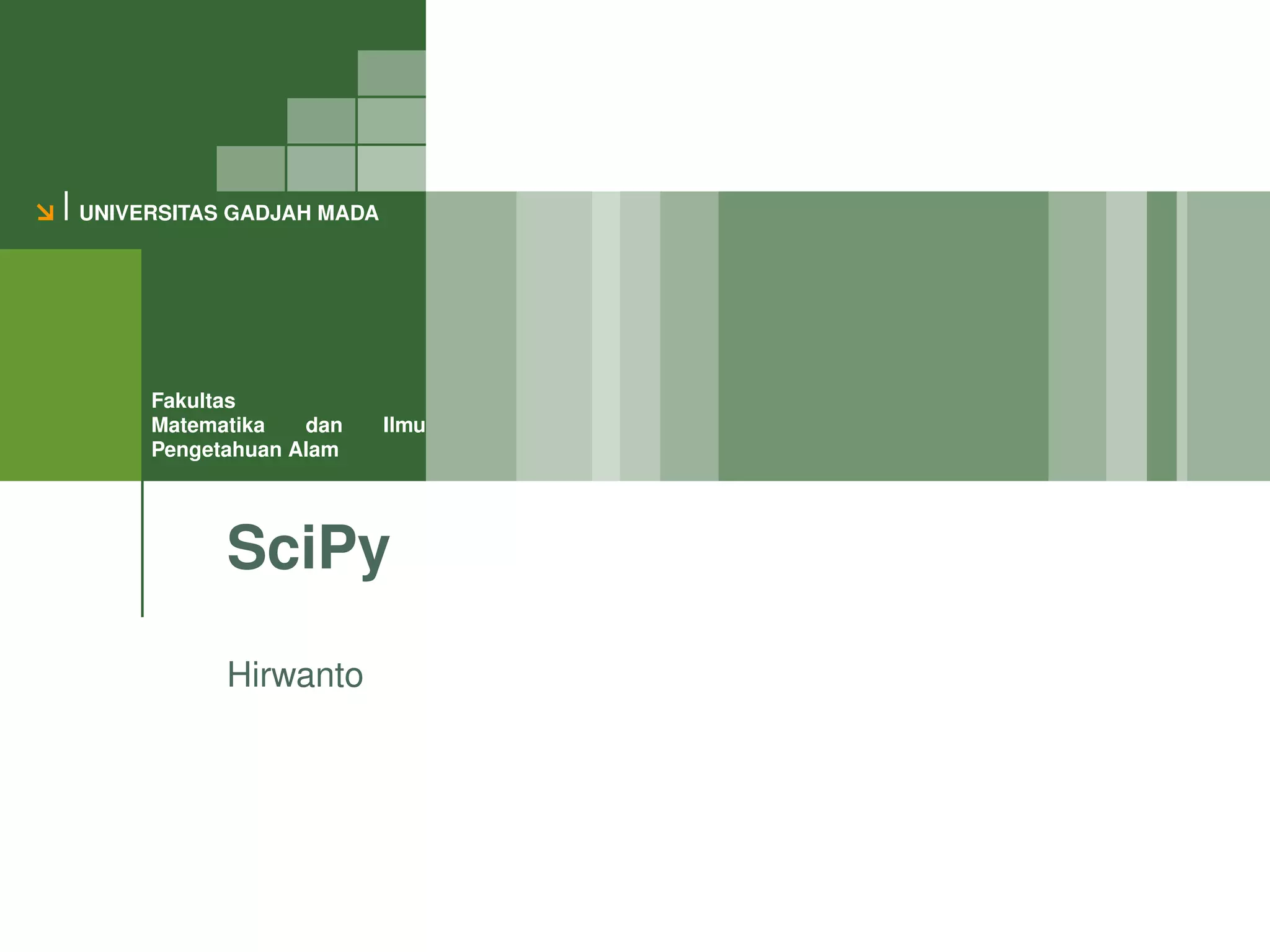 Scipy adalah pustaka Python yang menyediakan algoritma matematika dan fungsi untuk manipulasi dan visualisasi data, bersaing dengan perangkat seperti MATLAB dan R. Pustaka ini terdiri dari berbagai paket yang memiliki fungsi spesifik, seperti pengolahan gambar, aljabar linear, dan integrasi. Untuk menggunakan Scipy, pengguna perlu mendefinisikan perintah dengan mengimpor modul yang relevan.