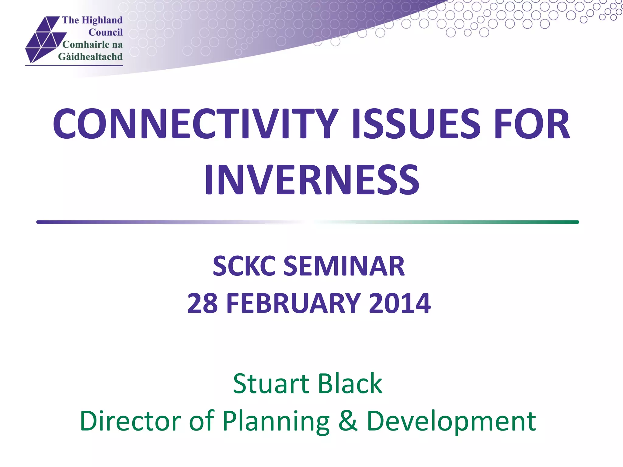 The document discusses connectivity issues for Inverness and proposes solutions. It outlines Inverness' airlinks to international hubs through its airport, as well as strategic road and rail links. It also discusses active travel initiatives to promote cycling and public transport investments. Regarding digital connectivity, it describes government plans to improve broadband access throughout Scotland, including Inverness, and ensure access to digital skills and technologies. The conclusion emphasizes that physical and virtual connectivity are key to the region's sustainable economic growth.