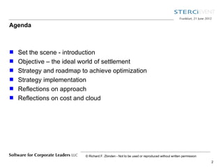 The document discusses the optimization of nostro reconciliation and the challenges faced in achieving an ideal settlement process. It outlines strategies for improving data quality, reducing system complexity, and leveraging cloud solutions for reconciliation services. The author emphasizes the importance of exception management and suggests a roadmap for enhancing reconciliation efficiency through technology and process improvements.