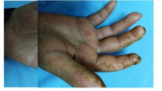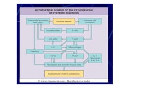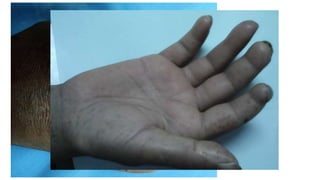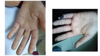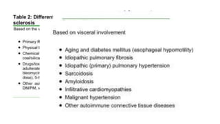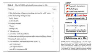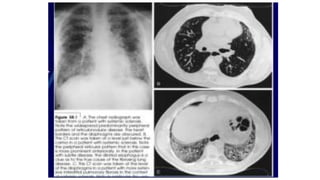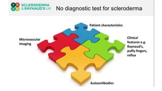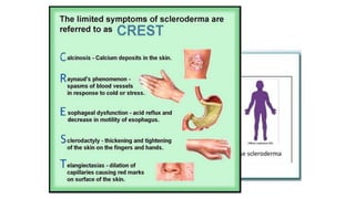 - The patient presents with dyspnea, fatigue and Raynaud's phenomenon. Physical exam shows thickened skin on fingers and telangiectasias on face and palms.