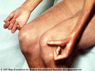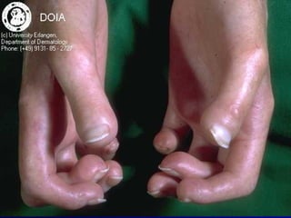 This patient has systemic sclerosis for 3.5 years with tight skin on hands and face, pain in knees and feet, and morning stiffness. He has multiple medical issues including renal failure and is wheelchair-bound. Examination found tight skin on hands and face. His current management includes physiotherapy, wax, and treatment for his other conditions. Further tests are needed to monitor his systemic sclerosis and complications.