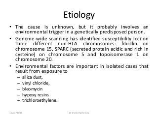 Scleroderma is an autoimmune disease characterized by fibrosis of the skin and internal organs. It can be localized, affecting only the skin, or systemic, also involving internal organs like the lungs, kidneys, and gastrointestinal tract. The cause is unknown but involves genetic susceptibility and environmental triggers, and it results from immune system activation, inflammation, vascular damage, and overproduction of collagen by fibroblasts in the skin and organs.