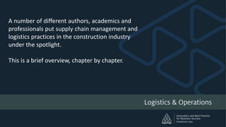The document is an overview of supply chain management and logistics in the construction industry, analyzing various aspects and challenges faced in the field. It covers strategic perspectives, the impact of new technologies such as BIM, and the role of logistics in sustainable construction. Additionally, it discusses logistics operations, the importance of data management, and the evolution of roles within construction logistics.