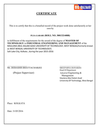 Puja Garari completed a project report on supply chain management at Big Bazaar as part of her MTech degree. The 3 page summary document provides an overview of the project which studied customer satisfaction levels and awareness of products/services at Big Bazaar stores in Kolkata. It found that while customer satisfaction was high, many were unaware of offerings beyond what other retailers provide. It recommends improved promotional activities to better inform customers.